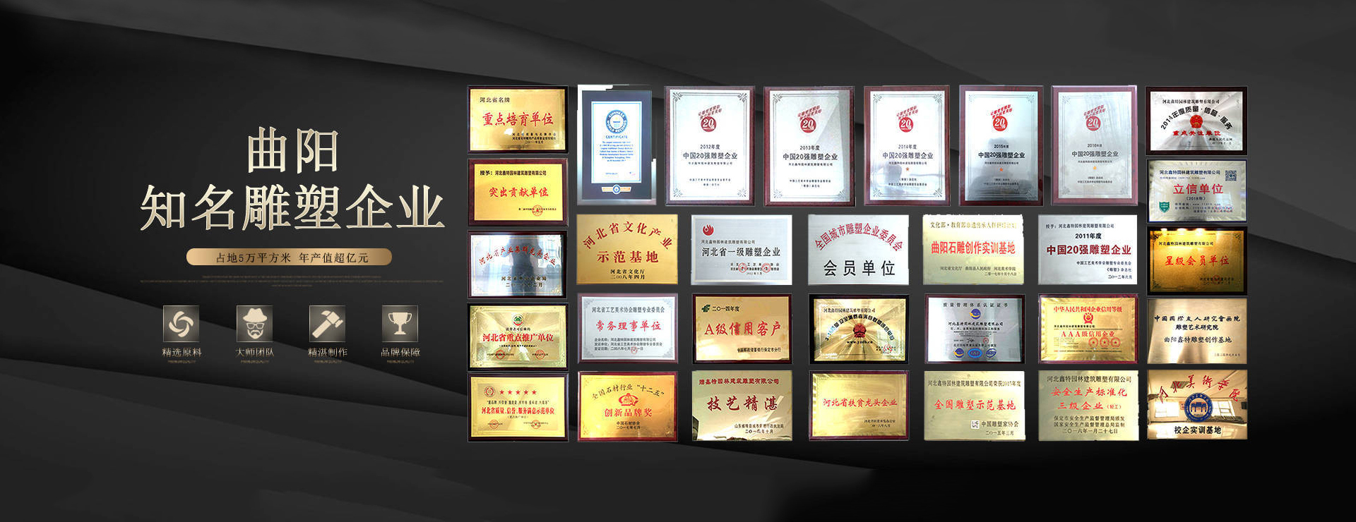 同時,公司也是行業內的佼佼者,連續七年榮獲“中國20強雕塑企業”,并被命名為“全國雕塑示范基地”,在國內外雕塑藝術領域享有較高聲譽。2017年,曲陽縣河北鑫特園林雕塑公司還被文化部、教育部、人社部命名為“中國非遺石雕傳承人群研培實訓基地”。